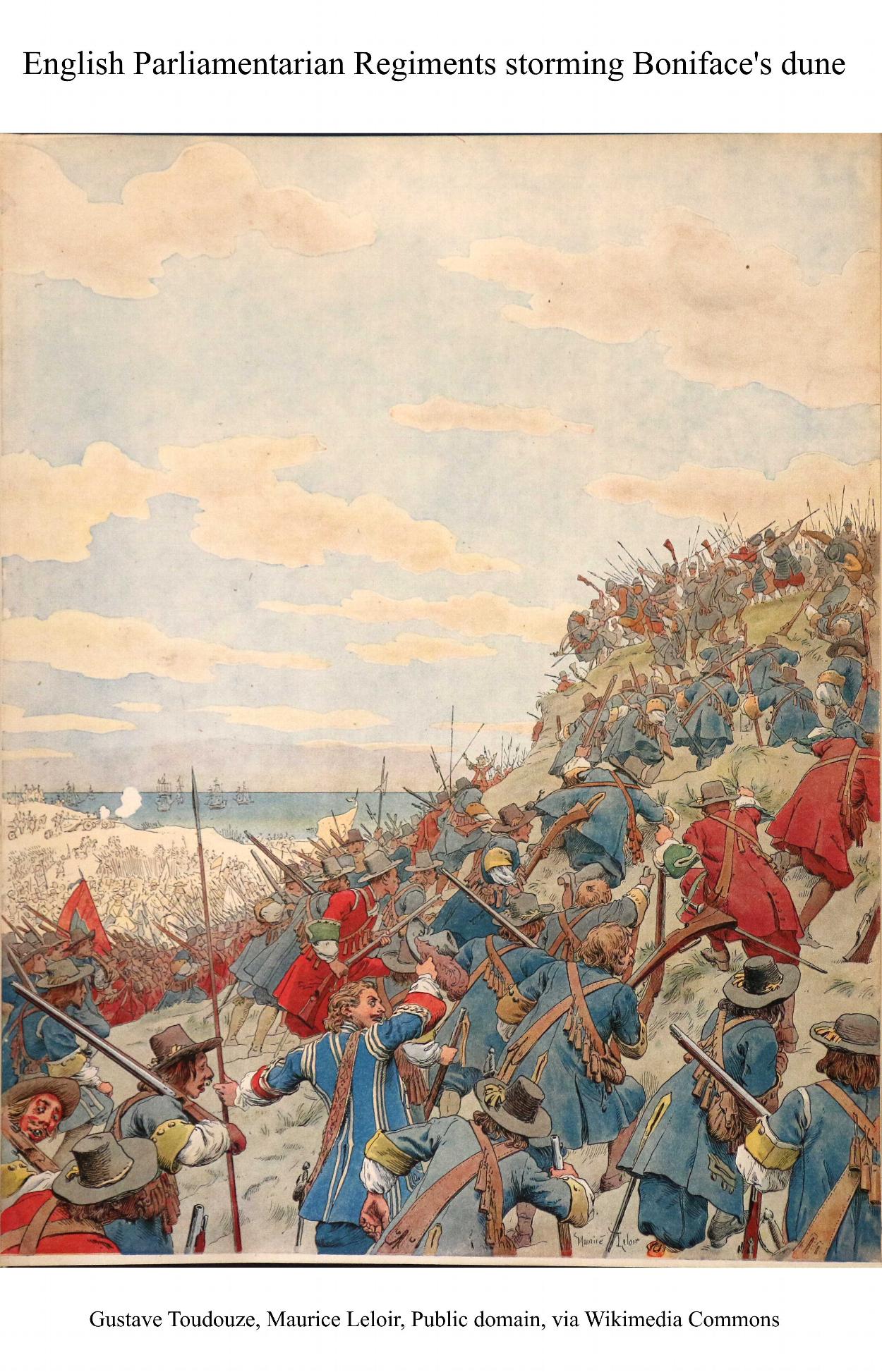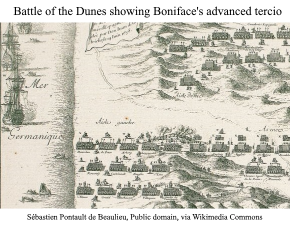When the Parliamentarian Regiments approached the Spanish defensive lines they found themselves opposite Boniface's elite tercio square of pikes and muskets ensconced on the top of a steep sand-dune, some 45 metres high, in advance of the main Spanish line. The Spanish formation was reinforced with a detachment of Royalist English from the King's Own behind whom the Duke of York was positioned with his cavalry.