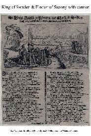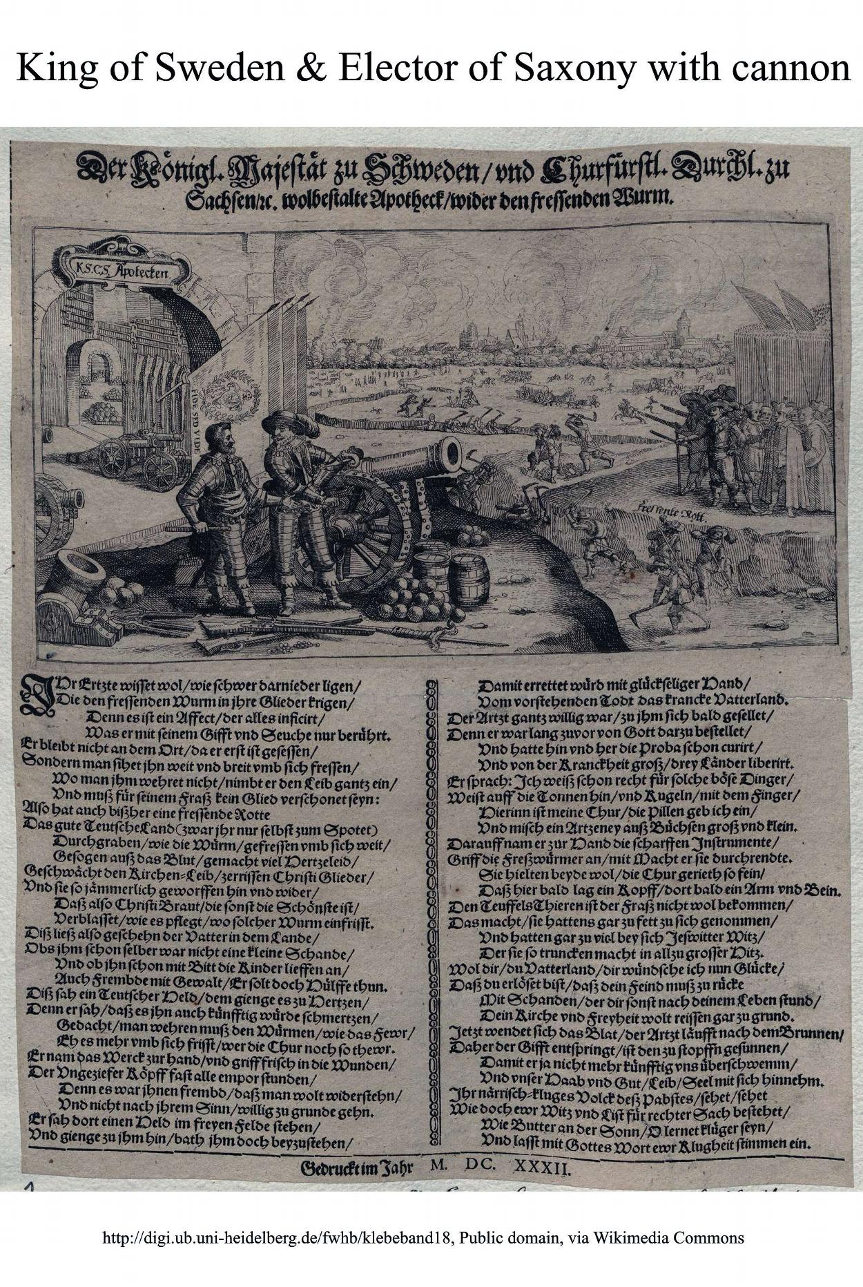 King Gustavas Adolphus and Elector Johann George as 'saviours' from the war - with cannons, rifles and bullets as medicines
