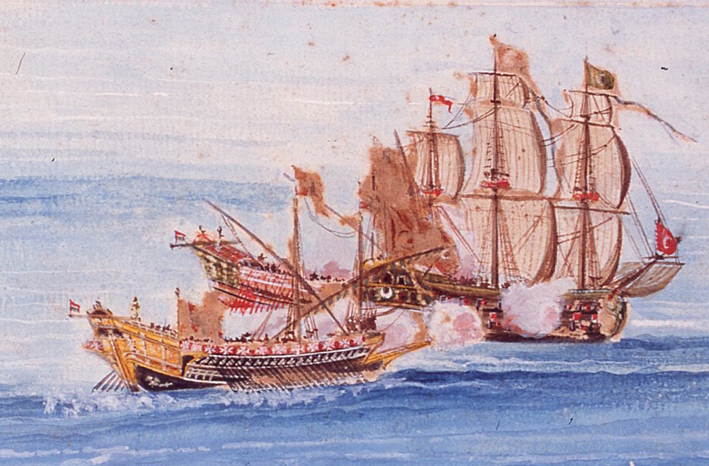 This detail from a watercolour in Museum Palazzo Falson, Mdina, Malta, shows the Knights of Malta flagship, recognisable by its black hull, with sails furled for action, rowing at full speed into the attack with cannon firing. The boarding party of Knights and men-at-arms stand on the foredeck ready to leap onto the Muslim vessel, with back-up lining the gangway all down the galley. A second galley, with the usual red hull, is shown attacking the far side of the Corsair.