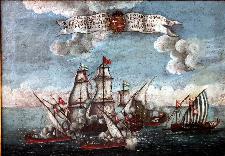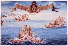 The painting, here shown in full, depicts the defeat of the infamous renegado, Beccassa de Tripoli who, having fought alongside the Knights in their Corso changed sides to lead a group of Muslim Corsairs. In 1638 the General Balj Carajut caught up with the ‘Ammiraglio di Barbaria' off Calabria and despite the renegade's 3 ships, 45 cannon and 500 men defeated him, taking more than 200 Christian slaves and all the Corsairs' plunder along with the 3 ships.