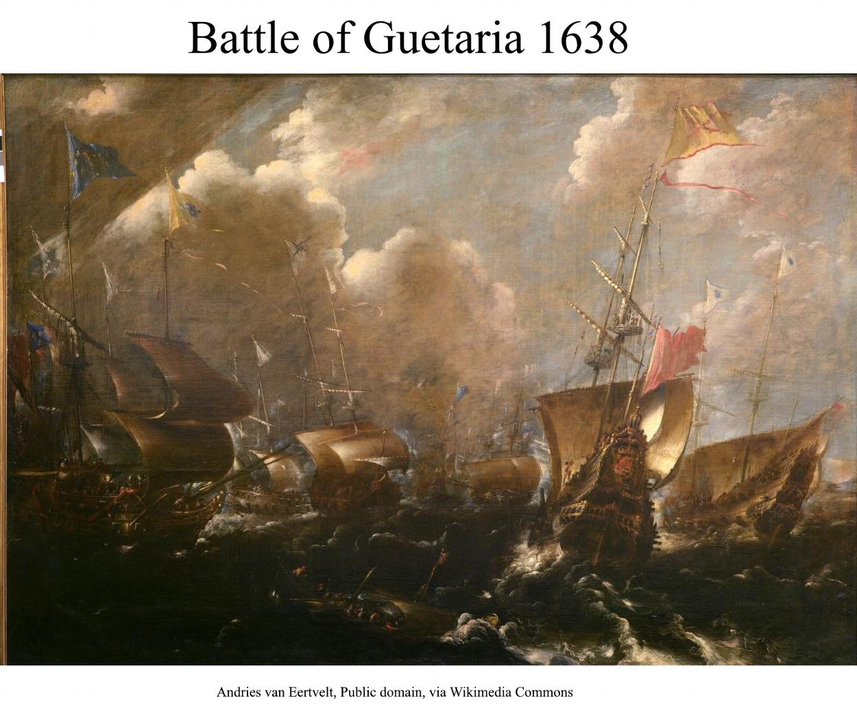 Unfortunately, in August 1638 the newly built French Atlantic Fleet scored a significant victory at Guetaria on the northern coast of Spain. Although the results of this victory were short-lived this was the first French success against the Spanish navy in many years. Later, in 1639, the Spanish suffered another defeat in the Battle of the Downs when a large fleet transporting 9,000 soldiers and 3 million escudos bullion from Spain to Flanders was trapped in the Downs by the Dutch. The Dunkirk contingent of the fleet managed to smuggle most of the reinforcements and all of the bullion to Dunkirk in their frigates – their shallow draft and ability to be rowed across the sandbanks making possible this dramatic escape. Nonetheless the loss of about thirty galleons was significant as far as the Spanish navy was concerned. and Spanish losses (in Brazil?) etc