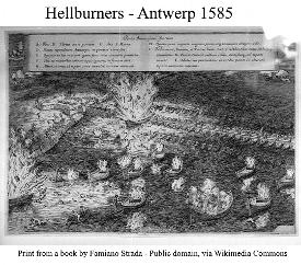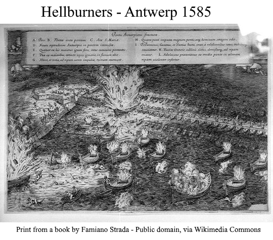 Spanish attacks on Antwerp in 1585 were repelled by Frederigo Gambelli's ‘Hellburner' devices - disguised as conventional fire-ships these were actually particularly nasty combinations of gunpowder and directed shrapnel.
