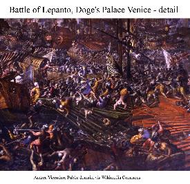 In 1571 Spain and her allies destroyed the Ottoman fleet at the Battle of Lepanto, temporarily removing the threat from the expanding Muslim power of the eastern Mediterranean. This great battle comprised large fleets of galleys rowing towards each other at great speed, firing their front-facing cannon and crashing together in preparation for hand to hand fighting between the Sultan's Janissary Army and the Tercios of Spain, ably assisted by Christian galley-slaves freed during the battle.